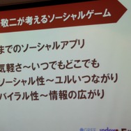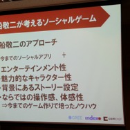 稲船氏はこれまでのソーシャルゲームについて「気軽さ~いつでもどこでも」「ソーシャル性~ユルいつながり」「バイラル性~情報の広がり」という良さがあり、これは今後も伸ばしていく必要があると言います。その一方で、これらを強化する一つとして、エンターテインメント性、魅力的なキャラクター性、背景にあるストーリー設定、ならではの操作感、体感性、といったこれまでのゲーム作りで培ったノウハウも生かせるのではないかと稲船氏は言います。
