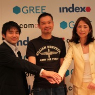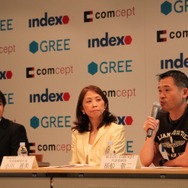 会場に集まったのはグリー株式会社 執行役員 マーケティング事業本部長の小竹讃久氏、株式会社インデックス 代表取締役社長 小川善美氏、そして株式会社 comcept 代表取締役 稲船敬二氏という3名です。