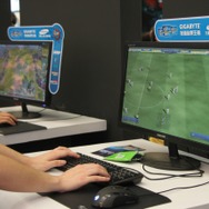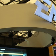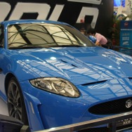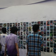 ステージの裏手に体験スペースがあり、中央にはブルーが鮮やかなジャガー「XKR5」が。『ニード・フォー・スピード』仕様ですね。ブースの壁面にはエレクトロニック・アーツが過去に発売してきた膨大な数のゲームパッケージが並び、それぞれが思い思いのコメントを書き込んでいました。