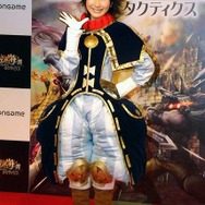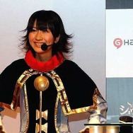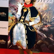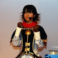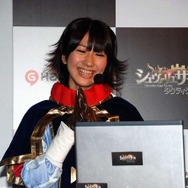 発表会ではAKB48の石田晴香さんも駆けつけ、オフィシャルナビゲーターの初仕事として、デモプレイを披露しました。「見た目が可愛いから」という理由でメイジのコスプレを身にまとった石田さんは、アバターにもメイジを選択。「ミカゲ」「クロカワ」というファイターを引き連れ、モンスター退治に向かいます。ゲーム初心者で、本作をプレイするのも初めてという石田さんは、周囲の心配をよそに、メイジで肉弾戦に挑戦。雑魚キャラを一層すると、ボスキャラに「メテオ」の魔法を繰り出し、見事撃破しました。