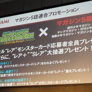 第2弾ではミスマガジンが『ドラコレ』に登場するモンスターのコスプレ姿で華やかに登場。GREE内でドラコレガールズとして活動している彼女たちの発表により、講談社より発売されている“マガジン”5誌との連動プロモーションが明かされました。これは各誌のQRコードを読み取ることで以下の超豪華オリジナルレアモンスターカードがゲットできるというもの。こちらもWチャンスとして、“レア+”や“Sレア”のモンスターカードが抽選で用意されています。