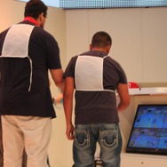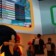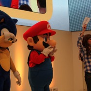 マリオのステージではゲストとして隣のセガブースからソニックが登場。『マリオ&ソニック AT ロンドンオリンピック』を使ったゲーム大会が実施されました。会場から参加者を募り、フィギュアスケート、水泳などの種目で得点を競っていきます。優勝者にはマリオとソニックからメダルがプレゼントされていました。