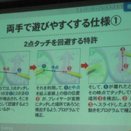 『タッチ!ダブルペンスポーツ』は両手で2つのタッチペンを使うという奇抜さからスタートした企画です。しかしそれには課題が幾つかあります。まず技術的にはDSは2点タッチの場合、その中間を値として返すという制限があります。それを上手く回避する技術を特許として取得しています。また、UIデザインは奇抜だからこそ分かりやすいものにする必要があります。