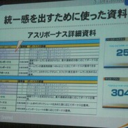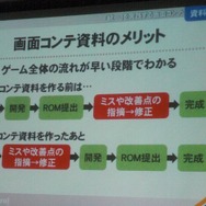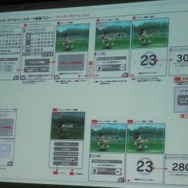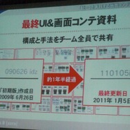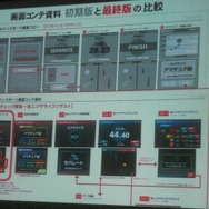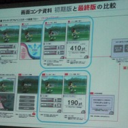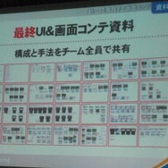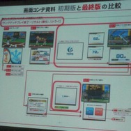 その中で重視されたのは画面コンテだそうです。ニンテンドーDSの登場により、2画面の開発になるため、それぞれが作っていく画面の共通化を図る必要性が増したと言います。画面コンテは開発中、随時更新されていて大きくブラッシュアップされたといいます(初期版は2009年6月作成、最終版は2011年1月作成、ちなみに途中でDS→3DSに機種変更)。