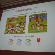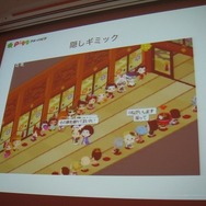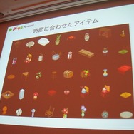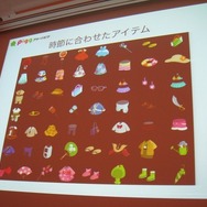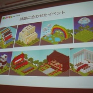 氏曰く、現在アメーバピグは毎日コンテンツを追加し時節に合わせたアイテムを提供、社内で「鬼の運用」と言われるくらい徹底的な運用を行っているそうです。例えばチャットをしているとユーザーから「疲れた」という声を聞くことがあるそうですが、そんな時は椅子のアイテムを提供したり、実際の時節と連動させたりと「普段の生活」と同じような運用を心がけているとのこと。そのため月間アイテム製作は500点にも及び新イベントは毎日実施。これまでイベント用の「おでかけエリア」だけでも1000以上の公開実績があるそうです。