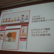 しかし意外なことにアメーバピグは開始後後半年はノンプロモーションだったとのこと。しかしその後システムが安定してきたこともあってアメブロとの連動を加えてプロモーションを行うようになったそうです。まずリリースしたのは空間の中を撮影してそのままワンクリックでアメブロに投稿できる写真撮影機能。これがブログ記事が自然に増殖する圧倒的な集客エンジンの役割を果たし、さらにその後Amebaのマイページの中にもワンクリックでアメーバピグに移動できるようバナーを貼るようになったとのこと。
