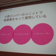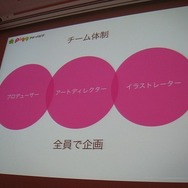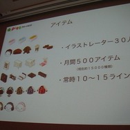 この膨大な数の仮想アイテムの企画出しは「プロデューサー」「アートディレクター」「イラストレーター」の3チーム全員が行っているとのこと。チーム間に上下関係はなく、お互いクロスチェックできるので何か問題になりそうな企画が出るのを防ぐこともできるそうです。仮想アイテムはイラストレーター30人で月間500アイテムを制作し常時10?15ラインが稼動。最終的にどんな仮想アイテムをリリースするかはブレストミーティングで決定。ブレストミーティングはだいたい1?2時間くらいで制作時間は半日。1回のリリースにつき10点の新アイテムを販売するというペースを続けているとか。本当に迅速(というか神速)な運用体制です。