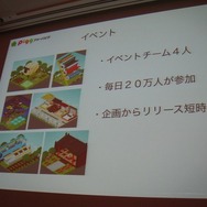 仮想アイテムと共に連日追加されるイベントのチームは基本4人(!)。このイベントエリアはリリースされるたび毎日20万人がアクセスするそうです。しかしその運用体制は企画~リリースまで短時間で1日かけないというこれまた迅速なもの。例えば上記の「サマークリスマスイベント」は、企画に要した時間が1時間、エリア・アイテム制作が4時間、計5時間でリリースしたとのこと。また世界陸上のイベントエリアをオープンしたときも、朝出社後「もうすぐ世界陸上だね」という話が出て「じゃあ作ろうか」という流れになり、夕方にはもうリリースしていたそうです。