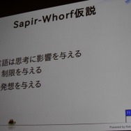 ここで、まつもと氏が紹介したのは「Sapir-Whorf仮設」。これは言語学における考え方で、言語は思考に影響を与えるというものです。例えばアマゾンの奥地の言語には数え方で1~3まで存在しない言語があるそうです。こうした言語では数学は生まれ得ません。また、イヌイットの言語には雪や氷を表現する言葉が70~80もあるそうです。こうした言語では豊かな表現ができそうです。日本語には雨を表す表現が沢山あり、情緒的な表現ができます。