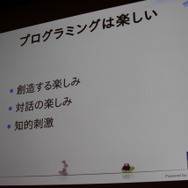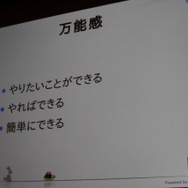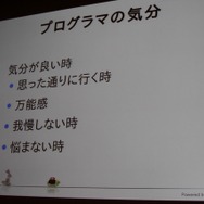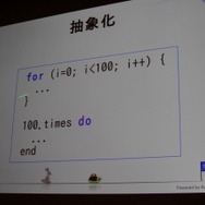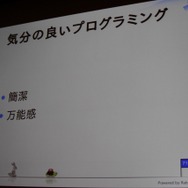 これはプログラミング言語にも適応できそうです。「殆どのプログラミング言語では、どのようなアルゴリズムも実装できます。しかしそのためのコストは言語によって異なります」まつもと氏がRubyという言語に込めた思いは"プログラマーにとって心地よいものにする"ということだそうです。同じ処理でもどれだけ簡潔に簡単に書くことができるか。性能や機能ではなく、プログラマーが良い気分でノリノリで書ける言語を目指すということです。