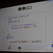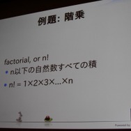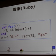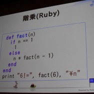 例えば同じ階乗の計算した場合、Rubyはいかに簡潔に書けるかが紹介されました。