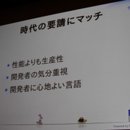 Rubyは人間が楽をできるように設計され、面倒なことはコンピューターがするように設計されています。もちろんこれはコンピューターパワーを必要とする考え方ですが、そのコンピューターの性能は急速に進化をしてきて、これからもしていきます。「スパコンを何億も払ってリースしている時代はコンピューターのリソースを節約する必要がありました。しかし今の時代、そんな必要はどこにもありません。人間が楽をするためにコンピューターが頑張る。これを積み重ねる事で気分のいいプログラミング言語に繋がると思います」