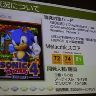 今回の講演の題材となっている『ソニック・ザ・ヘッジホッグ4 エピソードI』はソニックの原点に帰ったサイドスクロールアクションゲームです。全世界でほぼ同時配信、JEFIGSの6ヶ国語対応(日本語、英語、フランス語、イタリア語、ドイツ語、スペイン語)を行い、Metacriticで81点という高評価を得て、セールスも最初の一ヶ月で開発を回収したという結果を残しました。ソニックは欧米で今も根強い人気があり、現在も販売が伸びているそうです。最も大きな特徴は、家庭用のWiiウェア、PSN、XBLAに加えてスマートフォンのiOS、Windows Phoneで同一タイトルを同時展開したという点にあります。