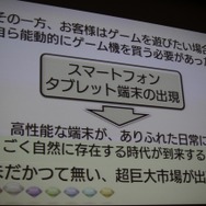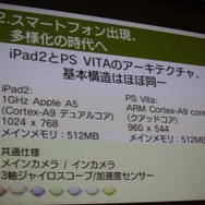 今回のプロジェクトの前提条件としてあったのは"家庭用ゲーム機とスマートフォンの差がほぼなくなった"ということです。長原氏は「iPadとPSVitaのアーキテクチャはほぼ同じです。全ての機器がシェーダーで描画する時代になり、ハードの性能差や境界といったものがもはやありません」と述べ、誰もが高性能端末を日常の中に持っているという時代になったと言います。ゲームを遊びたいと思わなくても、最先端のゲームを遊べる環境を誰もが持てるようになったわけです。かつてない巨大市場の誕生です。