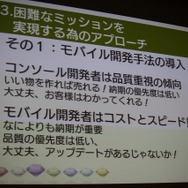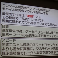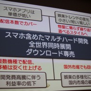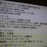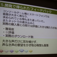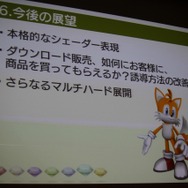 今後の教訓としては、販売手法の洗練が必要という考えのようです。例えばXBLAであれば対戦版→製品版のような誘引は様々な検討を行っているとのこと。また、現時点ではAndroid版がありませんが、それも含めて更なるマルチプラットフォーム化は今後必要となりそうとのことでした。ちなみに「ソニック以外でもこうした手法を取ったか?」という会場からの質問には「そうしただろう」との回答。ユーザーの持つハードの多様化時代の一つの解として考えられそうです。
