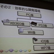 これを実現するために効率的な開発環境を構築。PCでベースのゲームを開発し、それをPS3/Xbox360/Wii版に落とし込み、さらにそこからiOS/Windows Phoneに最適化していきます。ベースを制作して、それを移植していくという形です。環境としてNNライブラリという汎用ライブラリを用いたとのこと。