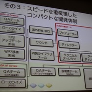 ちなみに開発体制は、企画が5-6名、アーティストが9-13名、エンジニアが10-13名という体制。開発期間は2009年4月~2010年9月で1年ちょっとという期間です。