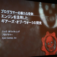 講演では、9月22日に発売されるXbox 360用アクション シューティング『Gears of War 3』の技術デモを交え、同社においてのプログラマーの役割と開発の効率化などが語られています。