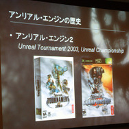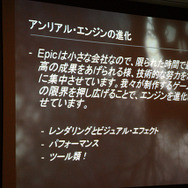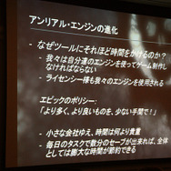 まず、UEの基礎ビジョンにおける最大の要素には、ハイエンドのレンダリングを新しいゲームとして提供していくことだと語っています。UEの中では最新のエンジンがUnreal Engine3で、代表作ではGoW3などがあげられます。また、現在ではiPhone向けなど他機種に渡るマルチプラットフォーム開発も可能とのことです。そのほか、ビジュアルエフェクトなど、表現性などを加味しつつも、小さなグループでゲームを制作できるように目指していると語っていました。