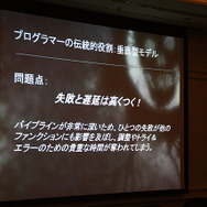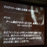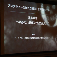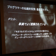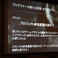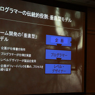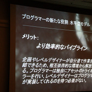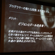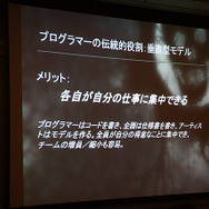 ホワイティング氏によると、これまでのプログラマーは、使用設計から隔離されている場所からフィードバックをもらって、作業をやり直すなどゲーム開発では垂直型モデルと呼んでいるそうです。このやり方は、古くから使われているので良く理解されているため、マネージメントやプロデューサーにとって扱いやすいといったほか、各自が自分の仕事に集中できるためクロスオーバーが不要だったり、一般的なニーズ以外にツール類への大きな投資を必要としなかったりするのがメリットだと同氏は語っています。
