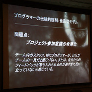 またレベルデザイナーがプログラマに依存する、デザイナーの作業に待っているという、依存関係が密接であり、チームメンバーが同時に作業をしているということになるので、非効率であるとも語られていました。