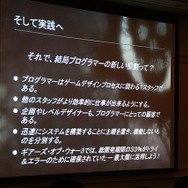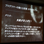たとえば、企画がボスモンスターの仕様をキズメットを使って設計していき、POCコンセプトできちんと継承。それぞれの担当している作業を行いながら、レベルデザイナーがざっくりとプロトタイプの制作を行い、さらに磨きをかけていくことができるそうです。まず、プログラマーの新たな役割とは、この時に早めのうちからプロトタイプ作成を支援して、早めに失敗することだと語っています。