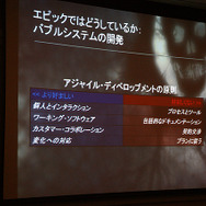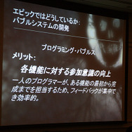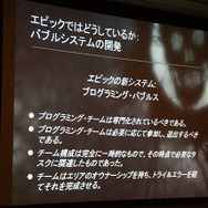 エピックでは、これらのツールと開発方針のほか、アジャイル・ディベロップメントを採用しているそうです。バブルシステムと称されたこのアジャイルは、たとえば、UIチーム、ストーリーモードデザインチーム、マルチプレイモードチーム、オンラインチームと4つのチームがあったとすると、プログラマーはそれらのチームと並列に作用し、たとえばデモ版の作成やE3前のプレゼンテーションを作成する必要が発生したら、ストーリーモードのチームから分散させ、作成することができる柔軟な対応が可能となっていると語っています。