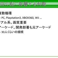 平山氏によると開発当初はPC、PS3、Xbox 360、Wiiの複数機種による開発が進められていたとのことです。リアル系の画質重視志向。開発部署は元々アーケードタイトル専門の部署であり、スタッフの人数は30人程度だったそうです。