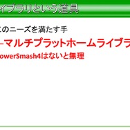 この結果、平山氏はマルチプラットフォームライブラリを作ることが今回の開発におけるニーズを満たす手段だという結果に辿り着いたそうです。結果的として「マルチプラットフォーム開発が前提であった、『パワースマッシュ4』では必須だった」と語っています。