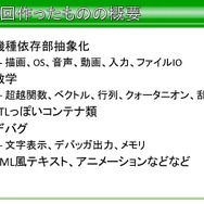 では今回作ったものというのはどういったものなのか。まず、平山氏が行ったのは、機種に依存する部分の抽象化だそうです。列挙していくと、描画、音声など機種依存部分から、超越関数、ベクトル、行列など数式におけるもの、STL(Standard Template Library)などのコンテナ類、文字の表示形式、デバッガ出力などになります。