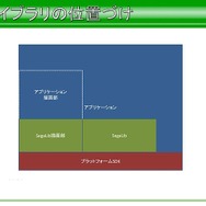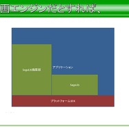 SegaLibの位置づけとしては、プラットフォームSDKの上に乗ったサブフレームのようなものとなります。平山氏によると、セガには共通のライブラリという概念がなく、各開発チームで個別に作るのがモットーみたいなスタイルがあるそうです。