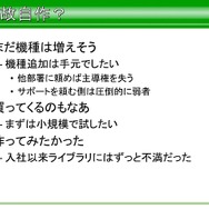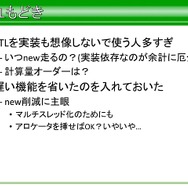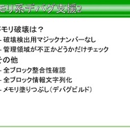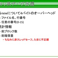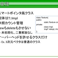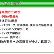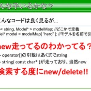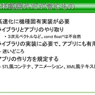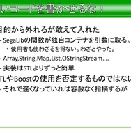 それ以外にも、本来はライブラリの範囲外ではあるものの、高速化に機種固定実装が必要なもの、スキニングが必要なものに対し、アプリ側の作り方を規定することで、STL風コンテナやアニメーション、XML風テキストなど、ライブラリの実装に必要でアプリにも有用なものなどはSegaLib内に実装したそうです。とはいえ、アプリ側に公開しているクラスタは一部であり、ショット時のパラメータ設定などは、所定のフォーマットを制定して、それに従ってもらったといった話もでています。