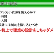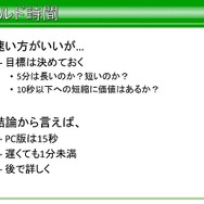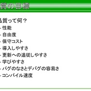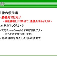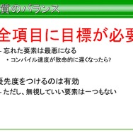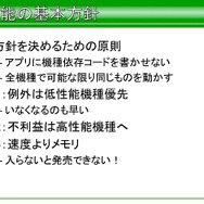 これらの項目をあげ、すべてにおいて全項目に目標が必要であり、優先度を設けるのは有効だが、無視していい要素は一つもないと語っています。またマルチプラットフォーム下において、全機種で可能な限り同じものを動かすため、平山氏が決めた基礎方針は、例外的な部分は低性能機種を優先にして作業すること、速度よりもメモリ管理が大事、メモリ内に入らないと発売できないからだと語っています。