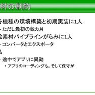 開発人員に関しては、各機種の環境構築と初期実装、SDKなどをインストールして、関数を書いたりする初期実装に1人。絵素材のパイプラインがらみに1人。平山氏は、途中でアプリケーション開発に異動しながらもライブラリの保守も行っていたそうです。実際には、最初に行ったのは開発機種すべてでゲームを形にするために2人で数カ月を対応。その後は平山氏が完成へとブラッシュアップを行ったそうです。
