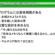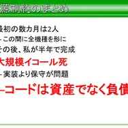 平山氏自身は大規模な開発は死を招くといったことや、実装よりも保守が問題となるといったほか、プログラムのコードは資産ではなく、負債というロジカルな考えがあるため、コードはあればあるほどもたらされる機能と量が今後の開発における負債に化けると語っています。
