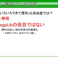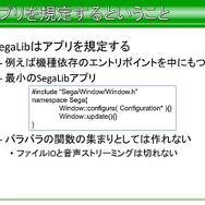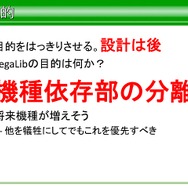 では、機種依存環境の分離ということでSegaLibに含まれないものとはなにか。平山氏は「設計部分に含めないものこそが重要で、β時点で含まれていないのは、作っていないのか、それとも含めないのかを明確にするのが大事です。これをノリで作ると未来に負債を残すことになる」と語っています。