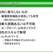 たとえばゲームの目的に寄与しない機種固有機能であるKinectやMOVEは提供してもライブラリに対してはメリットがないため除外といったものや、抽象化が困難あるいは不可能な機種依存によるセーブロード、OSのダイアログなどが代表例となり、そのほかにも現在の開発チームのスキルでは無理だったネットワーク機能など、技能的な部分も外したと語っています。