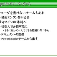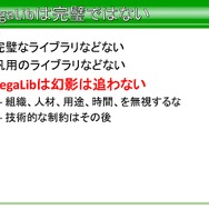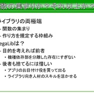 まとめとしてSegaLibを制作したにあたり、平山氏は「完璧なライブラリは存在しない、かといって汎用のライブラリなどもなく、SegaLibはその幻影を追わない。組織ごとに、人材、用途、時間などの問題があるので、しっかり考えることが大事です。また、プログラムには賞味期限があり、SegaLibも『パワースマッシュ4』のみで使用されて以後は使わなくなっても構わない」といったほか、ライブラリの度を越した延命は歪みを生むので、“今”使えるものを作る。そして、ライブラリは必ず肥大化するので、積極的に必要のなくなった機能は捨てなくてはならない。捨てるのを後にすると、歪みが発生する恐れがあるので、捨てても良い状況作り、捨てることを納得させるのが大事」と語っています。