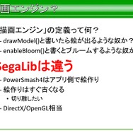 また『パワースマッシュ4』での描画部分の話になりますが、これはSegaLib側での制御ではなく、別途アプリ側で描画処理を行っているといった話も語られています。理由としては、描画部分はいずれ古くなるため、いつまでも持っているということではなく、切り離せるものが望ましいく、SegaLib内ではDirectXやOpenGL相当のライブラリしか持っていないといったことだそうです。