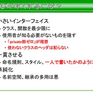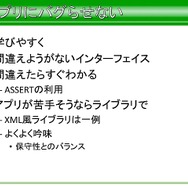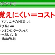 またアプリの制作者が知る必要がない余計な情報は隠し、作らないクラスのヘッダは配らないといったことなどから、命名規則やスタイルなど、情報を単純化させることで覚えやすくなるといった努力もしていたと語られていました。