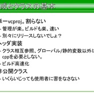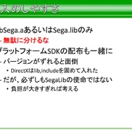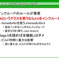 さらに、導入部分で平山氏は、導入のしやすさも意識して設計していたそうです。たとえばlibSega.aあるいはSega.libといった部分のみだけとプラットフォームSDKの配布を一緒に行ったほか、Aというクラスを使うならA.hをインクルード、VertexBufferを使うのであれば、VertexBuffer.hといったヘッダーからインクルードすればいいという話があったほか、反面Sega.hを読めば全機能が使えるといったことは推奨しておらず、これはビルドの時間に甚大な影響えるためだったそうです。