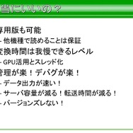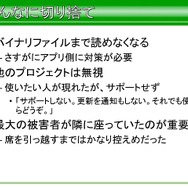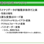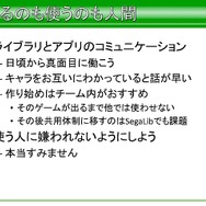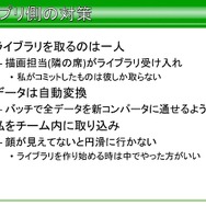 では、SegaLibに対して、アプリ側での対応方法はどうだったかという話になります。描画担当のプログラマーからライブラリを使用しているのは平山氏の隣の席に座るスタッフのみで行われ、担当者のアプリをビルド後に、動作確認をしてからバージョンの更新を行ったそうです。そのほかそのバイナリデータはバッチで自動変換。この隣の席のスタッフとのコミュニケーションの頻度が非常に重要だったと語っています。
