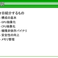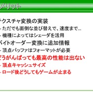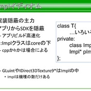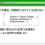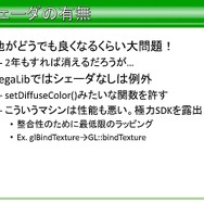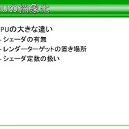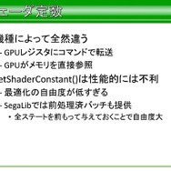 次にGPUの抽象化になりますが、GPUはシェーダーの有無、レンダーターゲットの置き場所、シェーダー定数のセット。特にシェーダー部分は他の仕事を放り出してでもやらなければならない問題が多かったと語っています。この問題を解決するにあたり、シェーダー機能がないハードウェアだけを例外処理扱いにしたそうです。また、整合性のために最低限のラッピングを行い、プログラム部分でもシェーダー機能のマシンは極力SDKを露出する方向で行ったと語っています。