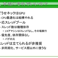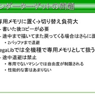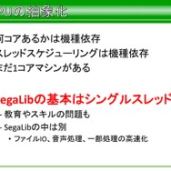 CPUの抽象化という部分では、1コアマシンが現存するため、SegaLibではシングルスレッドを基本に設計したそうです。これは、開発スタッフ全員がマルチコアに対するプログラム経験があったわけでもなく、教育やスキルの問題も発生する恐れがあったからだと語っています。