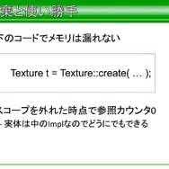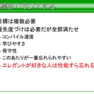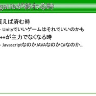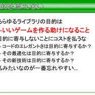 そのほかにも、あらゆるライブラリの目的はいいゲームを作る助けになることにあるといった説明のほか、「目的に寄与しないことにコストを払うなといったことや、コードのエレガントさは目的に寄与するか? その最適化は目的に寄与するか? その新技術は目的に寄与するか?そいう言うことを考える前に、ベーシックな部分を大事にすることを忘れてはいけない」と語られています。