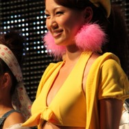 ステージにはグリーが提供する各種ゲームをモチーフにした衣装に身を包んだコンパニオンが勢ぞろいしていましたが、石川さんは黄色の『クリノッペ』の衣装が気になっている様子でした。