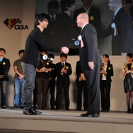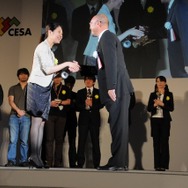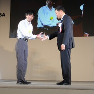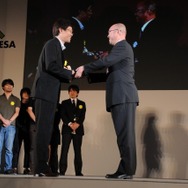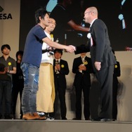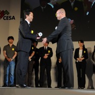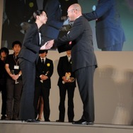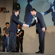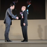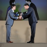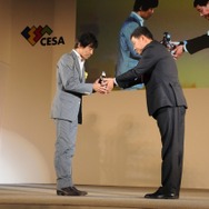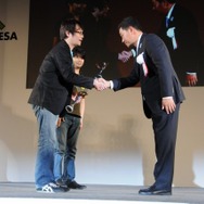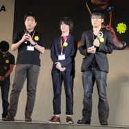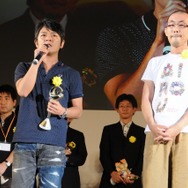 受賞式に登壇した同タイトルプロデューサーの辻本良三氏(左)とディレクターの一瀬泰範氏(右)は「このゲームはユーザーの皆様の口コミで広がっていったゲーム。実際に広めて頂いたユーザーの方々には本当に感謝したいと思います。」とコメントしました。