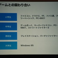 冒頭、田中氏はTGSということもあり、ゲーマー遍歴と共に自己紹介を行いました。1977年生まれの田中氏は、小学生の時にファミコンに触れ、『ドラゴンクエスト』にハマった世代。中学・高校時代は放課後ゲームセンターに直行し、『ストリートファイターII』『バーチャファイター』で腕を磨く毎日。その一方でキューハチのゲームも楽しんだと言います。その後、大学生でWindows95の洗礼を受けました。