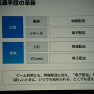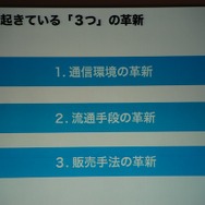 さて、その田中氏によると、現在のソーシャルゲームは「通信環境」「流通手段」「販売手法」という3つの社会変化と表裏一体で進みました。「通信環境」とは3G回線による常時接続環境。「流通手段」とは、いつでも好きなときに買えるダウンロード販売。そして「販売手段」とは少額課金が実現したアイテム課金販売です。