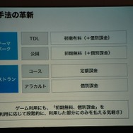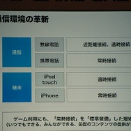 「まあ、iOSかAndroidか、はたまたHTML5が今後もスタンダードになるか否かはわかりませんが」としつつ、スマートフォンを中心とした環境がゲームに限らず、さまざまな専用機の機能を、急速に取り込んでいくのは確実と田中氏は分析します。こうした変化を踏まえて、サービスを考えていく必要があると言うわけです。